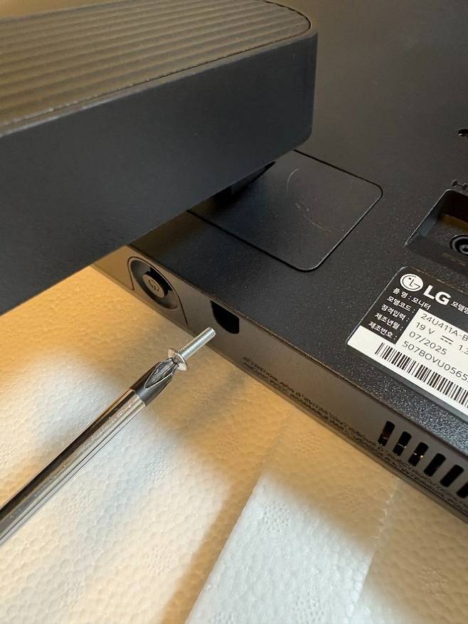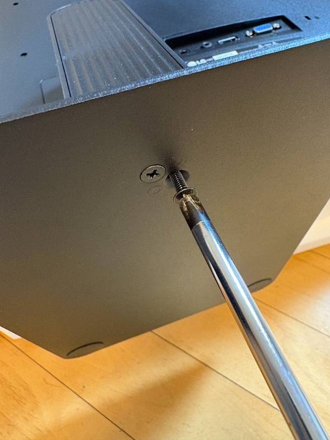 조립은 아주 쉽습니다. 본체와 스탠드를 나사 두 개로 연결하고 받침대와 스탠드를 고정하면 됩니다. 다만 본체와 스탠드를 부착할 때는 나사 홀이 너무 깊이 들어가서 긴 드라이버를 사용해야 합니다. 참, 작은 드라이버라도 하나 넣어 주면 좋았을 텐데, 공구는 제공하지 않으니 미리 참고하셔야 합니다. 스탠드와 받침대는 사진처럼 4개의 핀으로 고정되지만 2개는 나사입니다.