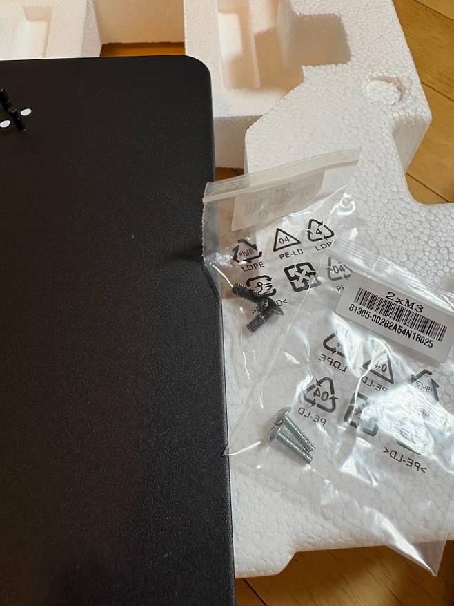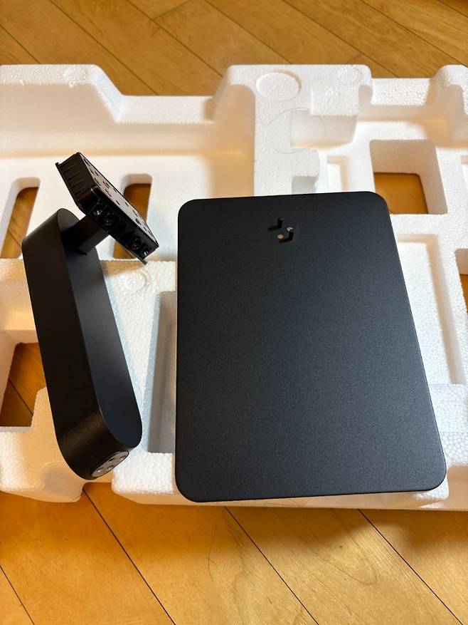 사진은 본체를 받쳐주는 스탠드입니다. 참, 이 제품을 고른 이유 중의 하나는 스탠드 때문이었습니다. 제품 소개 사진으로 봤는데, 스탠드가 너무 독특했어요. 다리 하나가 받침대와 한 점에서 만나는 듯한 연출 때문에 신기하면서도 예쁘더라고요. 어떻게 생겼나 봤더니 4개의 핀으로 고정하는 방식이네요. 조림도 어렵지는 않았습니다.