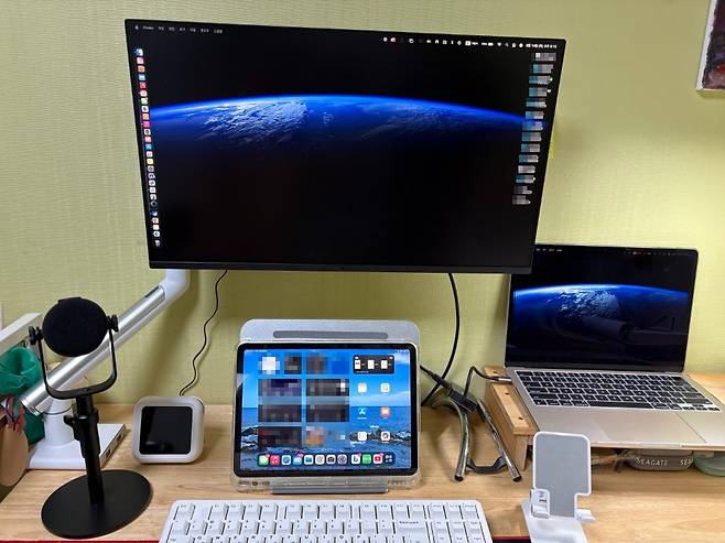 조금 사용하다 결국 저는 스탠드를 버리고 모니터암을 선택했습니다. 스탠드가 예뻐서 구매한 측면도 있는데 스탠드를 못 쓰다니 아쉽지만 목이 아픈 것 보다는 낫죠. 작은 책상이라서 24인치지만 화면이 작지 않습니다. 역시 모니터암이 공간 활용면에서나 원하는 높이 조절면에서나 정답인 것 같습니다.