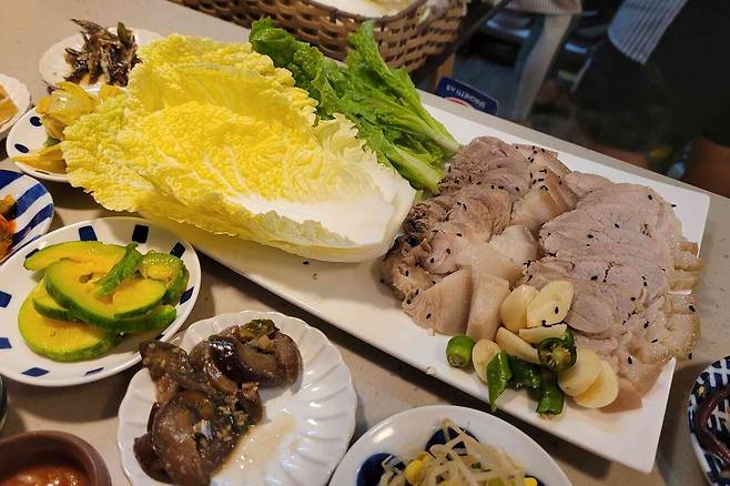 코스 요리의 기본적인 구성은 멍게, 낙지 숙회, 꽃게찜, 수육, 전복 등을 더해 두부구이, 버섯 & 가지 구이, 닭곰탕, 산적, 감자전 등 이모 셰프의 정성이 담긴 요리들이 끊임 없이 나와 어떤 음식에 손을 둬야할지 모를정도라 합니다.