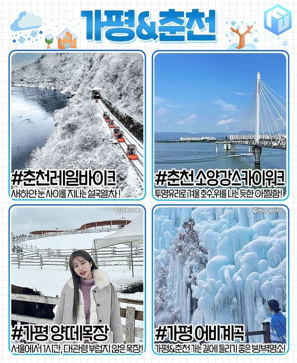 서울 근교 가평과 춘천은 접근성이 훌륭해 사계절 사랑받는 국내 여행지 중 하나입니다. 두 지역이 가까워 연계 관광으로도 적합하죠. 과거 70여년 간 운행되었다가 현재는 중단된 경춘선 레일 위를 달리며 수려한 춘천의 겨울 풍경을 감상할 수 있는 춘천레일바이크는 눈 내린 뒤 탑승하면 환상적인 설국열차 체험을 할 수 있습니다.