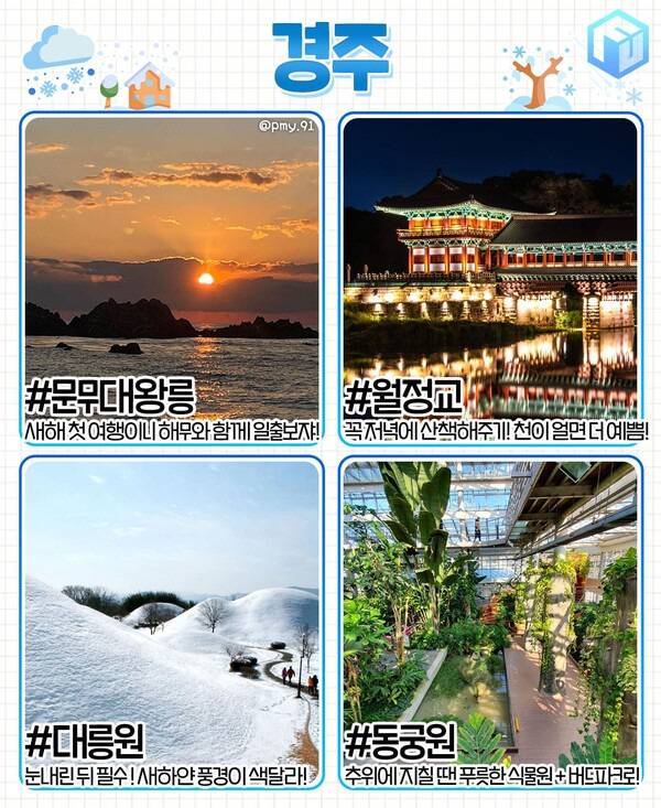 경주는 월정교와 대릉원을 중심으로 동궁과 월지, 첨성대, 황리단길 등 주요 관광명소를 모두 도보로 둘러볼 수 있어 난이도가 낮은 국내 여행지이기도 합니다. 눈 내린 다음 날, 새하얀 대릉원은 여름과는 또다른 풍경을 선사해주는데요. 밤 10시까지 경관 조명이 점등되는 월정교를 바라보며 겨울 산책을 즐겨보는 것도 좋습니다.