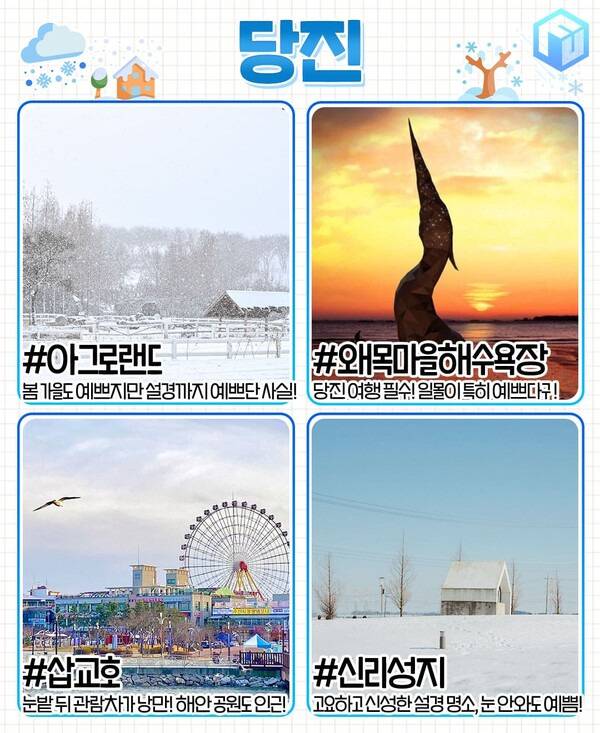 한적하지만 이국적인 겨울 풍경을 마주할 수 있는 1월 국내 여행지 당진입니다. 아그로랜드 태신목장은 봄과 가을, 수레국화와 코스모스로 뒤덮인 들판이 아름다워 셀프웨딩 명소로 손꼽히는 곳인데요. 겨울이 되면 목장 전역이 눈으로 덮여 동화 속 한 장면으로 들어온 듯한 착각을 불러일으킵니다.