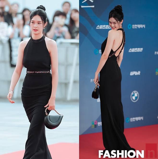 이날 이수현은 등이 깊게 파이고 늘씬한 몸매가 돋보이는 블랙 오프숄더 백리스 드레스룩으로 매혹의 뒤태미를 발산했다.