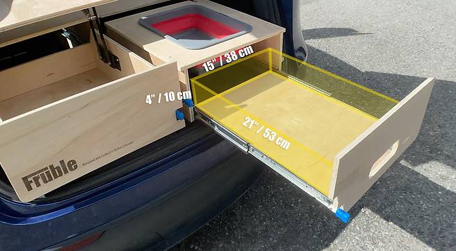 모듈식 구조인 키트는 2개의 뚜껑이 있는 상자와 뒷면에 있는 두 개의 슬라이드 아웃 서랍으로 구성돼 있으며, 모두 합판으로 만들어졌다. 뒷좌석 3열에 1명 또는 2명의 승객과 함께 여행할 계획이라면 앞쪽에 있는 뚜껑이 있는 상자 중 하나 또는 둘 모두를 제거하고 나머지 2개 위에 쌓을 수 있다. 후면 서랍에는 2구 가스 또는 전기쿡탑을 위한 큰 서랍과 작은 싱크대를 갖춘 주방이 있다.