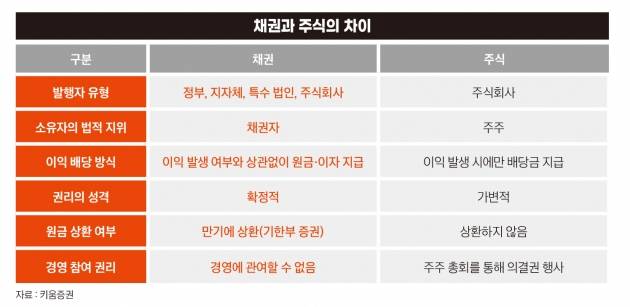 주식은 자기가 가진 지분만큼 경영에 참여할 권리가 있고 주주 총회에서 의결권을 행사할 수 있다. 반면 채권은 경영권과는 아무런 관련이 없다. 또한 주식은 기업의 이익에 따라 배당을 받을 수 있지만 채권은 기업의 이익과 상관없고 원금과 이자만 받을 수 있다. 물론 채권 발행사가 파산하면 원금 회수가 불가능하므로 ‘신용도’를 따져야 한다.