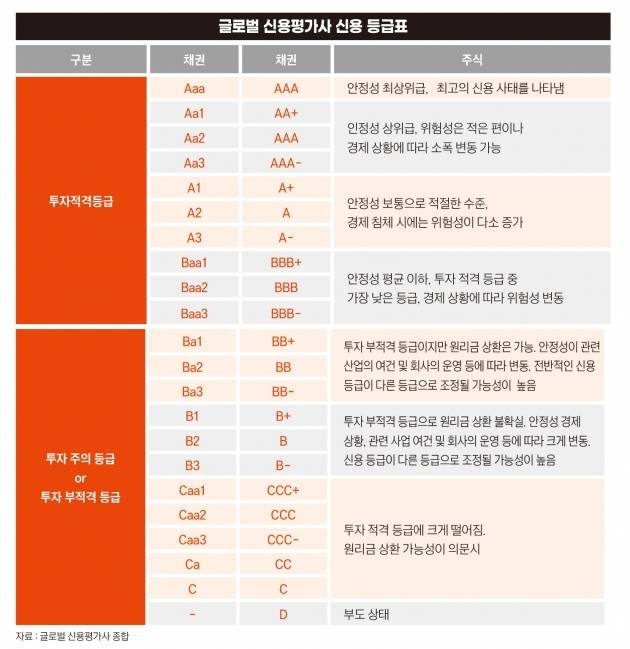 채권은 예금과 달리 발행 주체가 망하면 원금 손실을 볼 수도 있다. 이에 따라 채권에 부도가 날 가능성, ‘신용 위험’을 최소화하기 위해 신용 등급을 매긴다. 신용 등급에 따라 ‘트리플 A(AAA)’부터 ‘D’까지 18개의 등급으로 구분된다. 보통 ‘AAA’부터 ‘BBB-’까지가 ‘투자 적격’, 그 이후가 ‘투자 부적격’ 단계로 평가된다.