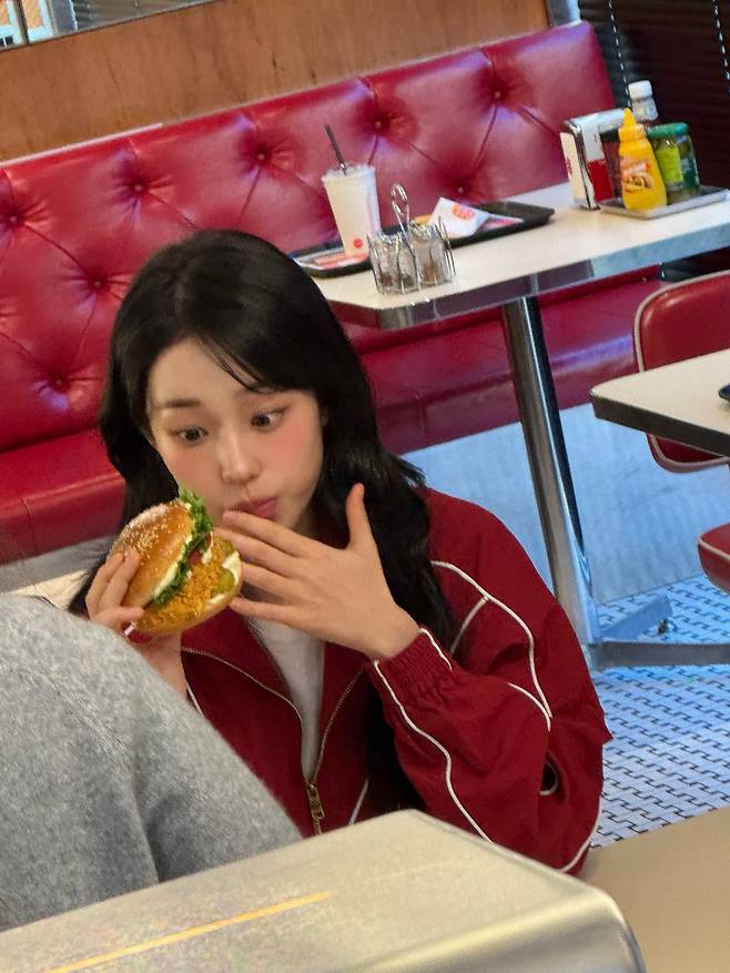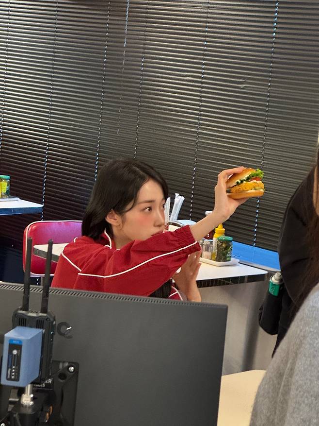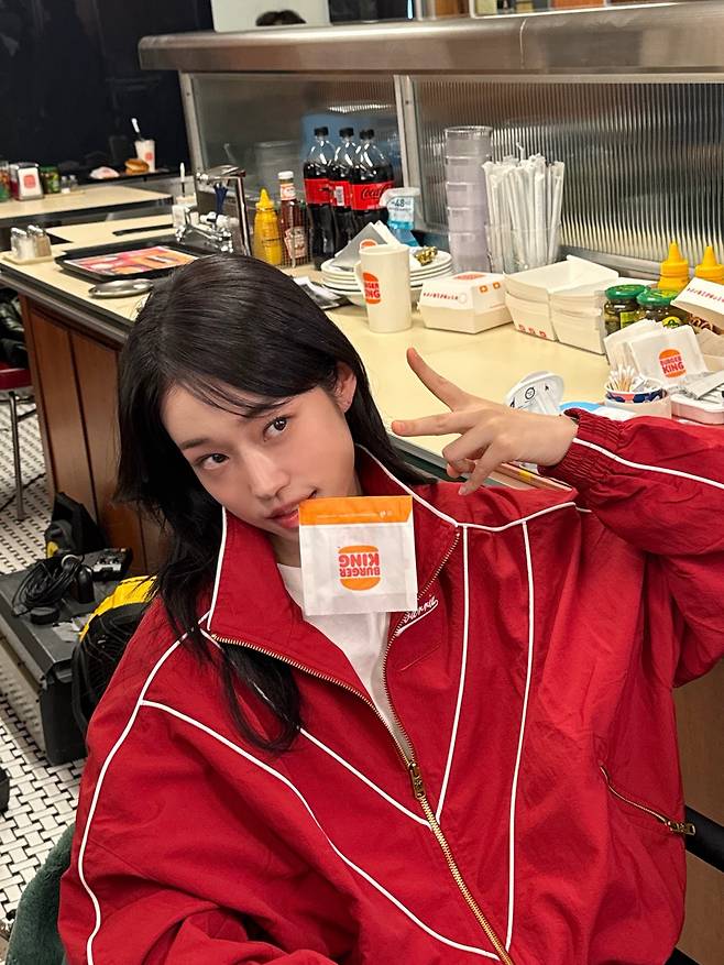 패스트푸드점을 배경으로 화이트 라인 디테일이 들어간 넉넉한 핏의 레드 트랙 재킷을 착용해 자유분방하면서도 힙한 에너지를 발산하고 있는데요.