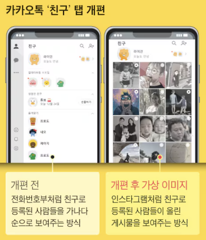 카카오 측은 최근 2분기 실적 발표 자리에서 이번 개편 계획을 공식화했습니다. 기존 전화번호부 형식으로 나열되던 ‘친구 탭’이 피드 방식으로 바뀌며, 친구들이 올린 게시물 콘텐츠가 중심이 될 예정입니다. 사진이나 영상 등 일상 공유 중심의 서비스로 재편하겠다는 구상입니다.