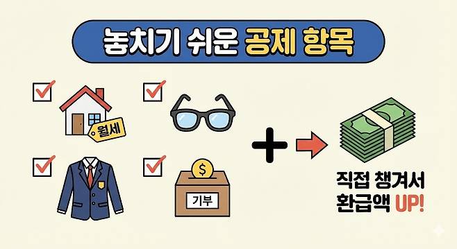 간소화 자료에 누락된 항목을 챙기는 것이 중요합니다. 예를 들어 월세 세액공제, 시력 교정용 안경, 교복·체육복, 유학자녀 학비, 일부 기부금 등은 자동 반영되지 않을 수 있으므로, 해당 영수증을 직접 제출해야 공제를 받을 수 있습니다. 또한 부양가족 등록 시 소득 요건을 반드시 확인해야 하며, 맞벌이 부부는 중복 공제 실수를 피해야 합니다.