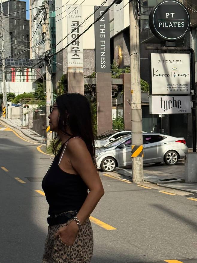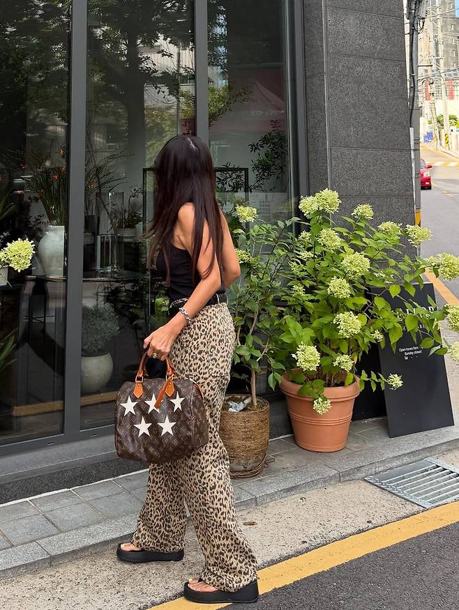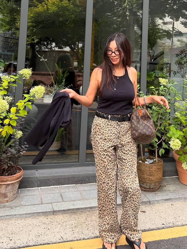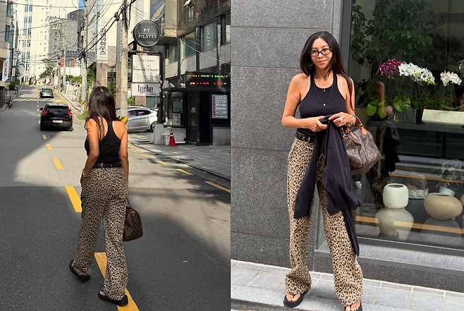 이날 황신혜는 몸에 자연스럽게 감기는 블랙 민소매에 과감한 호피 무늬 와이드 팬츠를 매치했다.