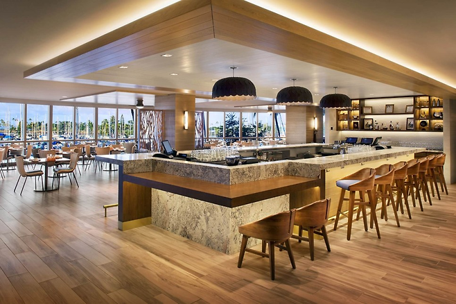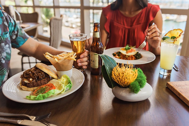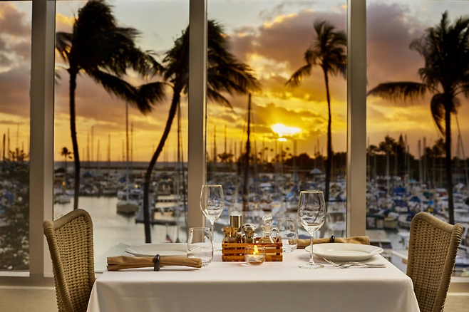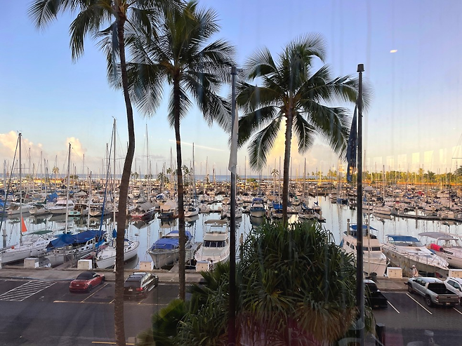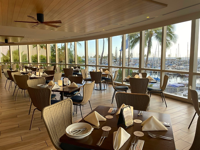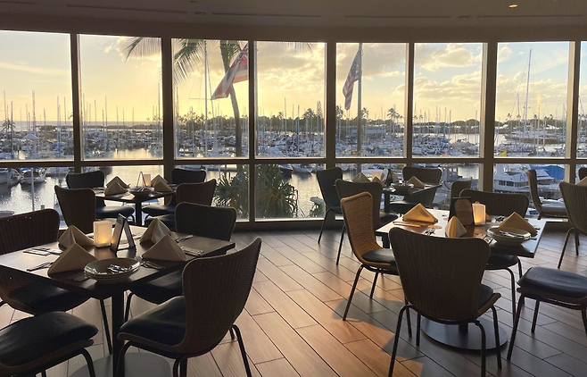 차례로 하나씩 살펴보기로 했다. 가장 먼저 뷰. ‘3층인데 전망이 좋을 수 있나?’라는 의문과 함께 들어섰다. 입장과 동시에 초스피드로 뷰는 입증됐다. 레스토랑의 통유리 밖으로 ‘하와이에서 가장 아름다운 일몰 장소’로 꼽히는 알라와이 요트 하버 뷰가 펼쳐진다.