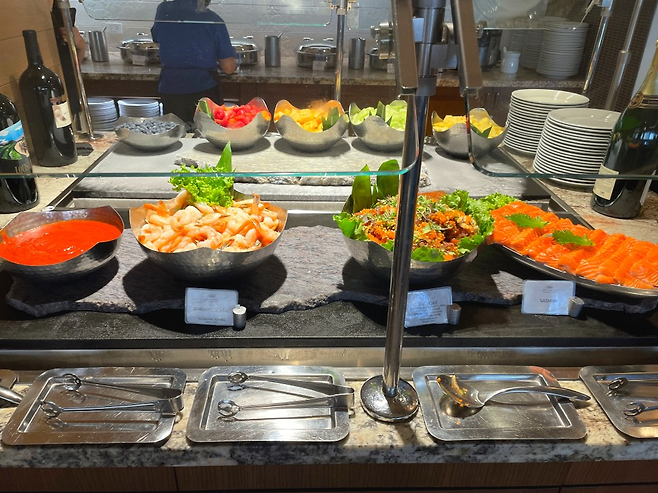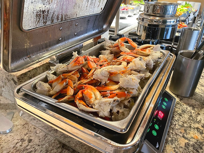 샐러드도 좋지만 이제 이곳의 하이라이트인 디너 뷔페를 더는 냄새만 맡고 있을 순 없었다. 샐러드바부터 새우, 굴, 게 등을 다채롭게 조리한 핫 스테이션, 사시미를 즐길 수 있는 콜드 바, 육류 메뉴 위주의 카빙 스테이션, 스시 스테이션, 디저트 등으로 나뉘어져 있다. 신선한 해산물, 프라임 컷 고기, 팜-투-테이블 샐러드까지, 전반적으로 한국인 입맛에도 큰 호불호 없이 즐기기 좋을 듯하다. 낯설지 않은 메뉴들과 크게 자극적이지도, 심심하지도 않은 맛이 인기 비결이 아닐까 싶다. 개인적으로 포케와 신선한 대게, 클램차우더 스프, 후토마키가 가장 만족스러웠다.
