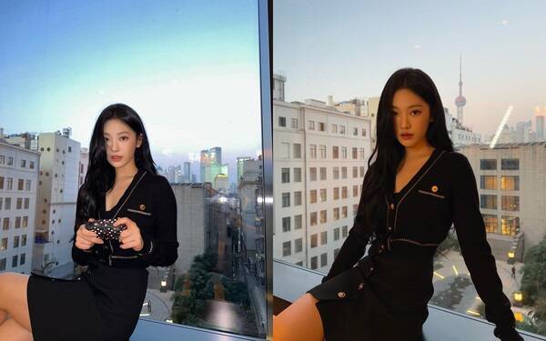 올 블랙 패션으로 세련되면서 고급스러운 스타일링을 선보였다. 언뜻 보면 원피스 같지만 블랙 크롭 가디건과 미니스커트를 매치한 투피스 코디이다.