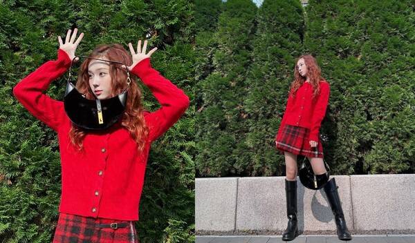 강렬한 컬러의 니트 가디건과 타탄체크 스커트, 스웨이드 미니 숄더를 매치해 인간 크리스마스 룩을 선보였다.