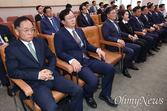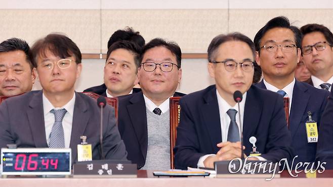 | ▲ 증인 출석한 엄희준 검사 대장동 사건을 수사했던 엄희준 검사(가운데)가 16일 서울 여의도 국회에서 열린 '윤석열 정권 정치검찰 조작기소 의혹 사건 진상규명 국정조사'에 증인으로 출석해 있다. 앞줄 왼쪽은 김태훈 대전고검 검사장, 앞줄 오른쪽은 이원석 전 검찰총장. |