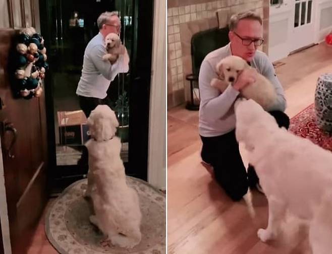 이날 아빠는 새끼 강아지를 품에 안고 집에 돌아왔는데요. 새끼 강아지를 발견한 골든 리트리버 강아지 핀은 꼬리를 흔들며 격하게 반겨줬죠.