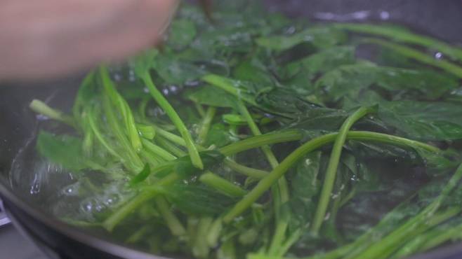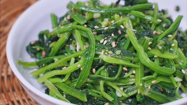 데칠 때 한 가지 팁은 조금 더 두툼한 줄기 부분부터 넣어야 잎까지 제대로 삶아져요. 총 50초 정도로 짧게 데쳐 주세요.