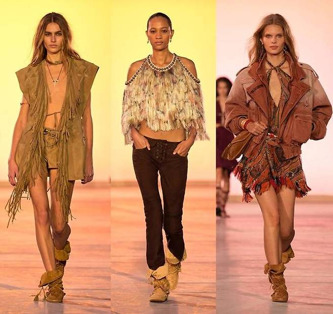 세 번째 키워드 ‘모토 보호(Moto Boho)’는 젠지부터 베이비부머 세대까지 모두가 선호하는 라이프스타일이다. 두꺼운 가죽 핸드백, 흐르는 치마, 모토 부츠, 약간의 프린지가 히피 분위기를 대체하여 좀 더 보헤미안적인 스타일을 선보이고 있다.