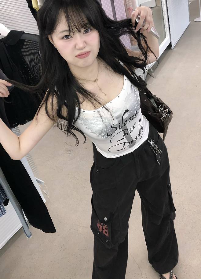 하의는 와이드 팬츠와 매치하면 균형이 맞아 부담 없이 즐길 수 있습니다.