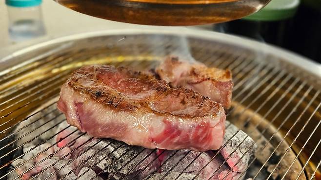 소금만으로 담백한 고기 고유의 맛을 즐기다가, 명란젓, 고추냉이, 쌈장 등을 가미하여 변화도 줘봅니다. 숯불에 구워 먹는 고기 자체가 맛있다 보니 어떤 소스와도 잘 어울리는 것 같습니다. 좋은 분들과 가볍게 한 잔 하며 어느 정도 고기에 심취하다 살짝 변화가 필요해 보일 때 젓갈을 조금 고기에 올린 후 먹어 보았습니다. 젓갈의 강한 맛이 숯불에 구워진 고기에서 흘러나오는 기름진 육즙에 어우러져 풍미가 확 올라옵니다. 소금에 담백하게 찍어 먹는 것도 좋았고, 젓갈의 강한 맛과 어우러진 강한 풍미도 좋았습니다.