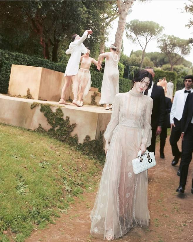 속살이 은은히 비치는 시스루 디테일의 누디톤 롱드레스를 착용해 고요하고 우아한 미모로 보는 이들의 감탄을 자아냈습니다.