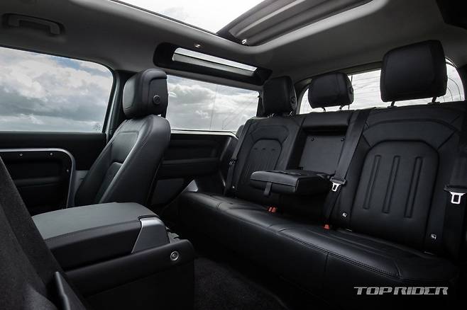 디펜더 90 P400 X에는 'X' 엠블럼, 14-WAY 1열 열선 및 통풍 시트, 빈티지 탠/에보니 윈저 가죽 및 크바드라트 프리미엄 직물 시트, 메리디안 사운드 시스템, 3D 서라운드 뷰, 헤드업 디스플레이, 어댑티브 크루즈 컨트롤 등이 기본 탑재됐다. 최대 도강 깊이는 900mm다.