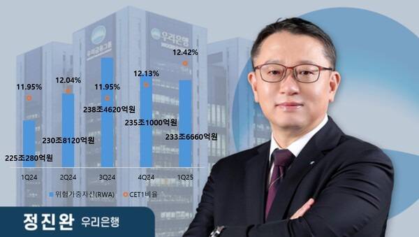 우리금융의 RWA는 2024년 3분기(238조4620조원)까지 증가 추세를 보이다 감소하기 시작해 올해 1분기에는 233조6660억원을 기록했다. 반면 같은 기간 CET1 비율은 11.95%에서 12.42%로 개선됐다.