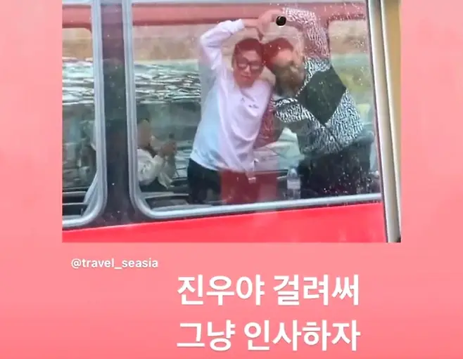 해당 영상은 한 제보자에 의해 여행 사진을 올리는 인스타 계정에 투고된 영상으로 기차 맞은편에 있는 제보자가 창문으로 인사하는 유세윤과 송진우를 찍은 영상이다.