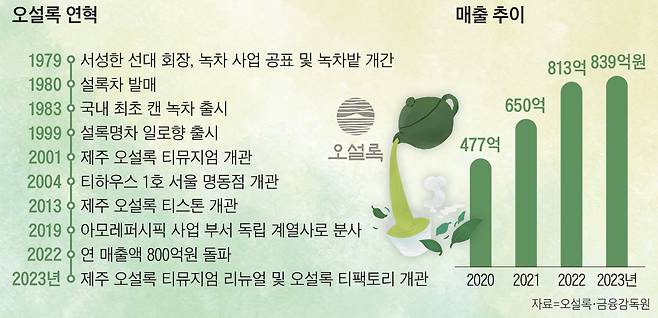 이런 노력으로 분사 당시 500억원대였던오설록의 연 매출은 지난해 839억원으로 뛰었다. 분사 전까지 적자를 냈던 영업이익도 이듬해 흑자로 돌아서 지난해 55억원을 기록했다. 화장품 사업만 하던 아모레퍼시픽그룹의 새로운 성장 동력이 된 셈이다.