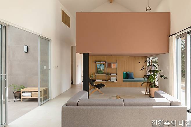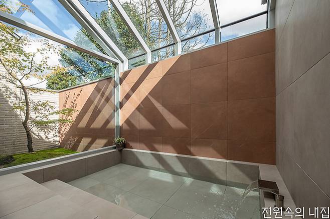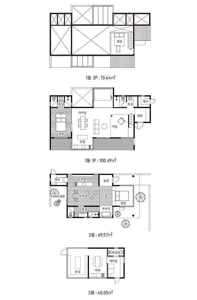 프로젝트를 진행한 일상작업실 건축사사무소는 건축적으로 목구조와 박공지붕 형태를 선택해 높은 천장고를 연출하고, 천창과 커튼월을 활용해 서정적이고 따뜻한 느낌을 주고자 했다. 또한 전체적으로 막힌 곳 없이 열린 구조로 시원스러운 개방감을 형성했다. 두 개 동 모두 실내 자쿠지 공간이 마련되어 있는데, 숨기지 않고 오픈형으로 배치해 공간의 특성을 살렸다.