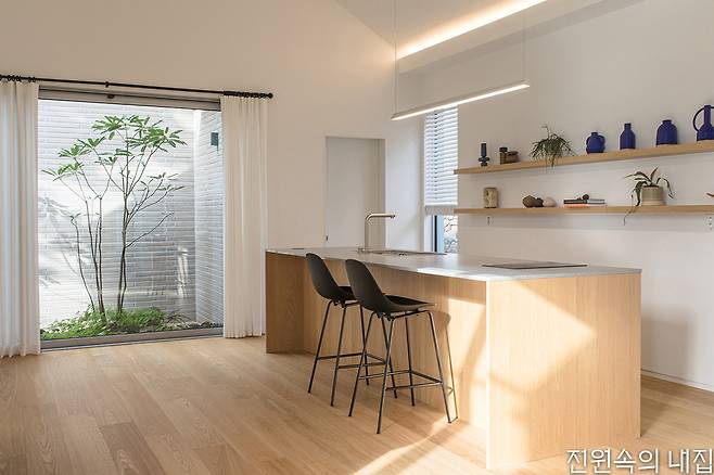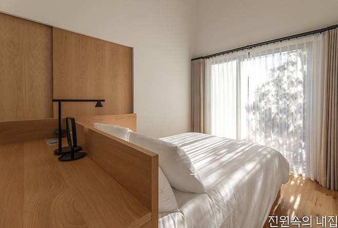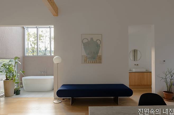 일상작업실은 “인테리어는 외부 정원의 분위기가 실내로 이어질 수 있도록 단정하고 간결한 스타일의 톤을 설정했다”라며 지나치게 단조로워 보이지 않도록 컬러 포인트를 적절하게 활용했다고 설명했다. 여기에 미술을 전공한 건축주 부부가 취향을 담아 선택한 아트 워크와 세라믹 오브제들이 스테이의 디자인적 완성도를 더욱 높여준다.