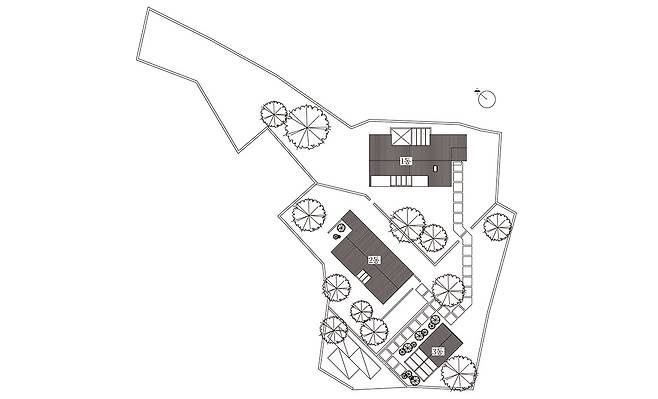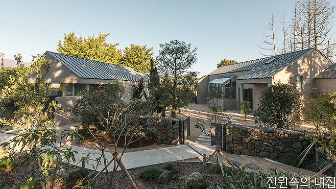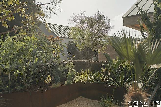 제주의 온화하고 청쾌한 정취를 닮은 박공지붕 건물 세 채. 오솔길을 따라 대지 안쪽으로 들어가면 규모가 다른 스테이 두 동이 번갈아 인사를 건넨다. 입구에서 바로 보이는 온실 건물은 숙소와 정원을 가꾸기 위한 작업실로, 방문객에게 편안한 환영의 이미지를 선사한다. “귤밭이 가득한 조용한 마을의 한 코너, 사계절 푸른 나무들이 둘러싸고 있어 따뜻하고 아늑한 분위기를 지닌 곳” 건축주는 공간이 품은 특성을 담아 ‘부쉬코너’라는 이름을 짓게 되었다고 전했다.
