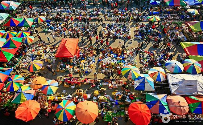 약초, 야채, 고추, 생선, 잡곡, 의류, 화훼, 가축까지… 진입부 ‘할머니 장터’부터 농수산부, 공산부, 음식부까지 4개 구역으로 나뉘어 있어 생활에 필요한 모든 것을 한 자리에서 만날 수 있습니다. 장날마다 손수 짠 들기름, 직접 키운 상추, 약초를 찾아오는 손님들의 발길이 끊이질 않습니다.