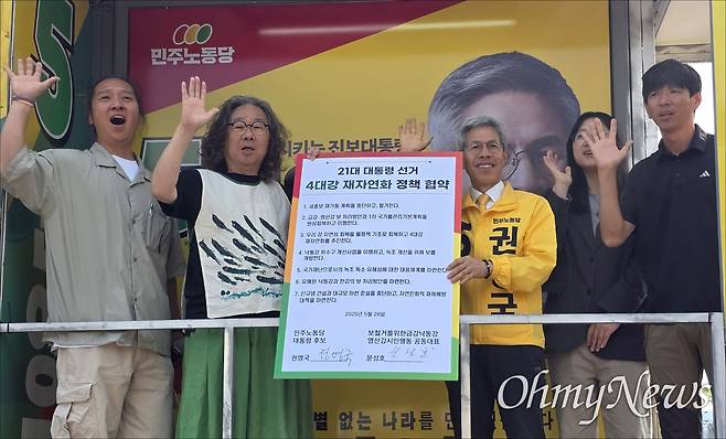 한편, 유세에 앞서 권영국 후보는 '보철거를 위한 금강·낙동강·영산강 시민행동'과 4대강 재자연화 정책 협약을 체결했다. 이들 단체와 권 후보는 협약을 통해 ▲세종보 재가동 계획 중단 및 철거 ▲금강·영산강 보 처리 방안과 1차 국가물관리기본계획 원상회복 ▲4대강 재자연화 추진 ▲낙동강 녹조 개선을 위한 보 개방 등 6개 항목에 합의했다.