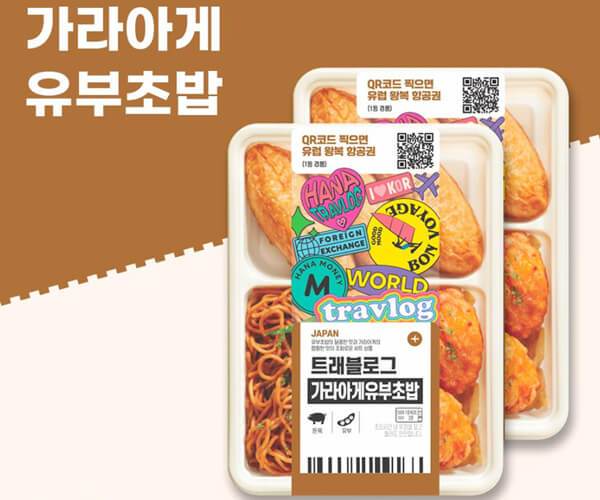 편의점 CU는 하나카드와 손을 잡고 특이한 콘셉트의 신제품을 출시했다. ‘트래블로그 가라아게 유부초밥’이 바로 그것이다. 트래블로그는 해외 가맹점 이용 수수료와 해외 ATM 출금수수료 무료, 환전 100% 우대 등의 혜택을 제공하는 해외여행 특화 카드다. 온라인 기반 트래블로그 카드의 오프라인 출시를 기념한 제품 출시로, 기내식 콘셉트의 간편식이다. CU 편의점에서 만날 수 있는 제품으로, 가격은 4,500원이다.