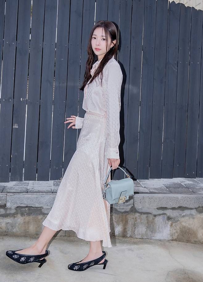 공개한 사진에서 채수빈은 긴 웨이브 헤어 스타일에 은은하게 광택이 도는 핑크 컬러의 실크 셔츠 원피스를 입고 청초하면서도 우아한 분위기를 완성했다.