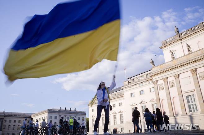 [베를린=AP/뉴시스] 13일(현지시각) 독일 베를린에서 열린 우크라이나 전쟁 반대 시위에 참석한 여성이 우크라이나 국기를 흔들고 있다. 2023.06.14.