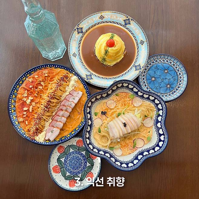 외국인들도 많이 찾는 익선동의 한옥 감성 맛집. 앉자마자 메뉴가 나오도록 대기 중에 주문을 미리 받아줍니다. 통삼겹 로제파스타, 항정매콤크림파스타와 회오리 오므라이스가 대표 메뉴. 꾸덕한 소스 위에 두툼한 고기가 올라가는데 느끼하지 않고 인테리어와 플레이팅까지 아름다워 눈호강 제대로 가능.
