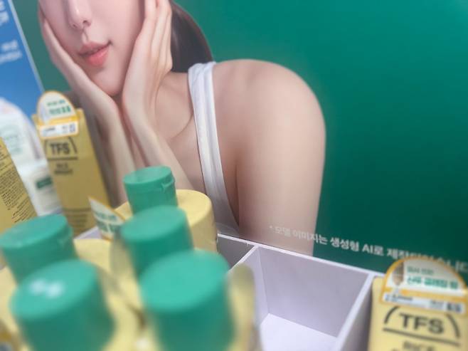 실제로 기자가 찾은 저가 화장품 매대에는 실존 인물인지 AI로 생성됐는지 모를 모델들로 도배돼 있었다. 유일하게 AI 모델 표시를 한 제품은 LG생활건강의 더페이스샵(TFS)이다. TFS는 매대 광고 오른쪽 하단에 조그맣게 AI로 생성된 이미지임을 밝히고 있었다. 문제는 해당 문구가 워낙 작아 소비자들이 인식하기 어렵고 심지어 매대 제품에 가려져 보이지 않는 경우도 있었다.