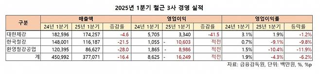 본지가 19일 금융감독원 자료를 통해 이들 철근 제강 3사 경영실적을 집계한 결과, 올 1분기(1~3월) 별도 기준 매출액은 총 3,771억원으로 전년 동기 대비 16.4% 감소했다.