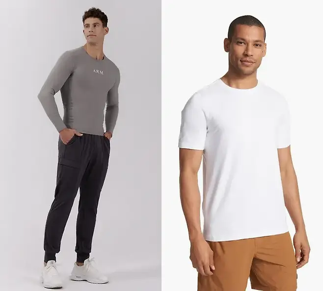 (왼쪽) 안다르의 ‘에어무스 맨즈 A.R.M 퍼포먼스 조거팬츠’, (오른쪽) 뷰오리의 ‘스트라토 테크 티셔츠’