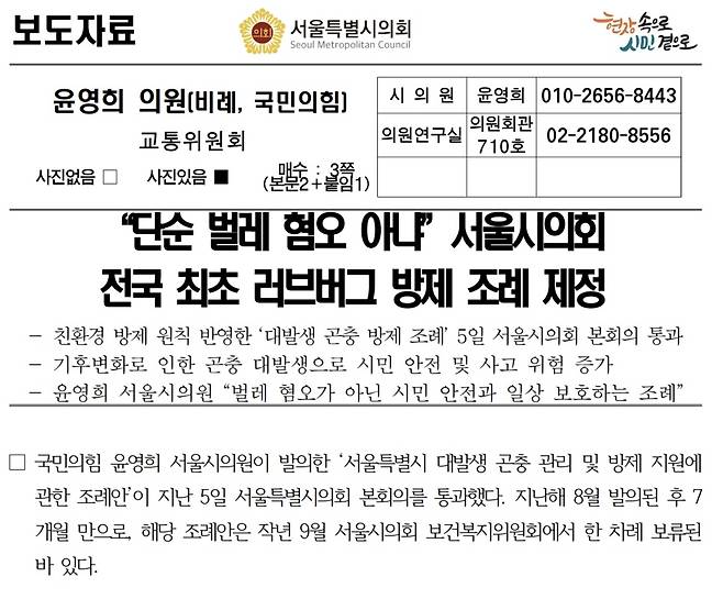 | ▲ 러브버그 방제 조례 제정 윤영희 의원 보도자료 캡처 |
