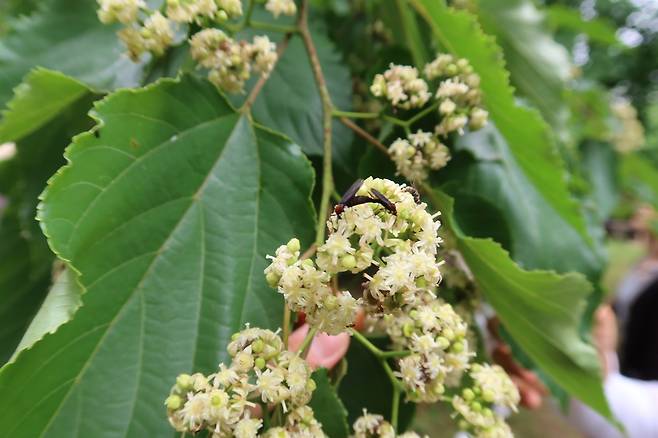 | ▲ 달큰한 헛개나무 향기에 이끌린 러브버그 한 쌍. 꽃가루와 꿀을 먹으며 식물의 수분을 매개한다. |