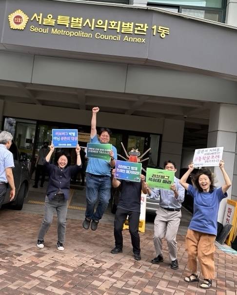 | ▲ 시민모임 활동가들이 러브버그 방제 조례안 보류 결정을 듣고 기뻐하고 있다. |