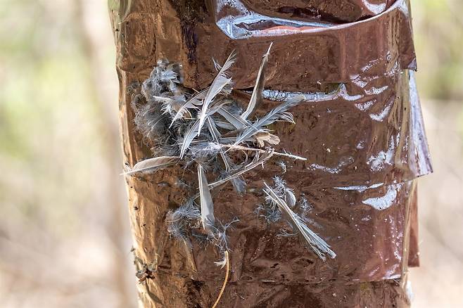 | ▲ 은평구 봉산에 설치한 끈끈이롤트랩에 소형 숲새류 깃털이 달라붙어있다. |