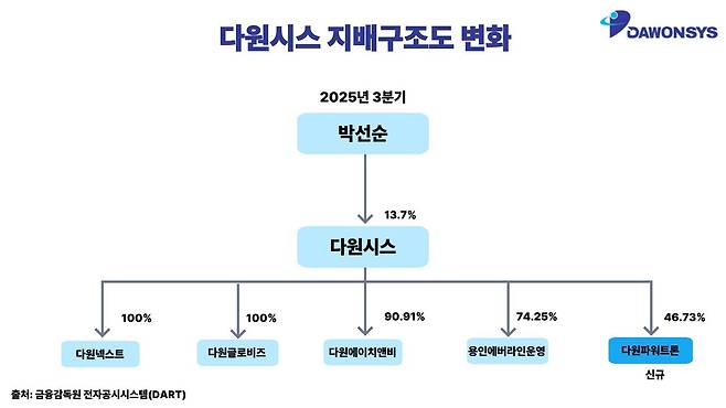 문제는 지분 구조 변화다. 다원시스는 다원파워트론을 올해 6월 분리·신설할 당시 100% 출자했다고 공시했지만 이후 유상증자 과정에서 외부 법인인 다원유니버스와 HB인베스트먼트가 참여하며 주요 주주로 올라섰다. 그 결과 다원시스의 지분율은 8월 기준 100%에서 46.73%로 줄었다. 완전 자회사였던 다원파워트론에 외부 투자자가 유입되면서 모회사인 다원시스의 지배구조에도 영향이 생긴 것 아니냐는 지적이 나오는 이유다.
