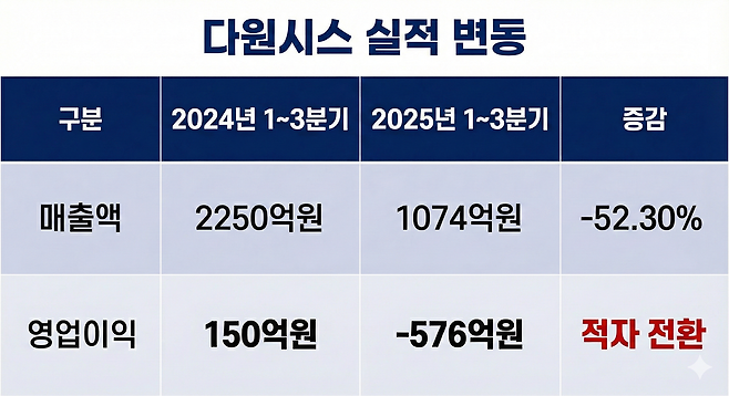 아울러 다원시스는 올해 영업실적이 악화했다. 1~3분기 매출은 1074억원으로 전년 동기(2250억원) 대비 52.3% 감소했고 영업이익은 150억원에서 576억원으로 적자전환했다.