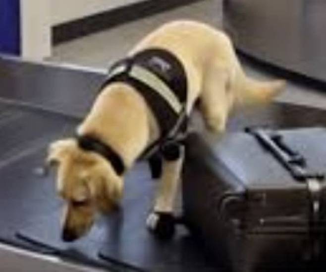 공황에서 근무를 하는 탐지견이 있습니다. 탐지견은 수하물들을 하나둘씩 냄새를 맡으며 수하물을 검사하고 있었습니다.