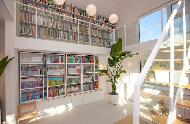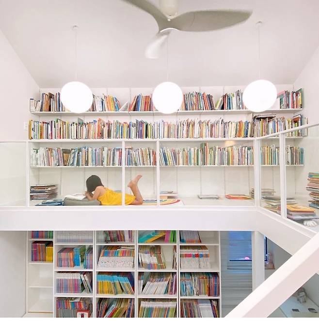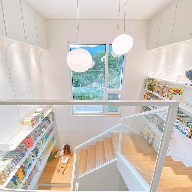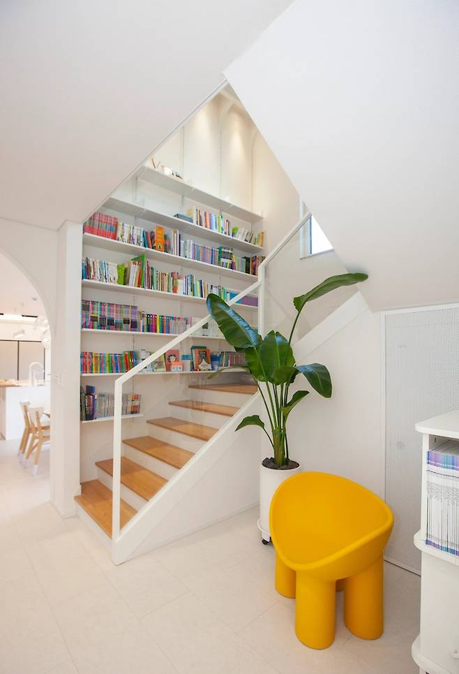계단실은 공간을 크게 만들어서 양쪽 벽에 책장을 넣어 두었더니, 아이가 오며 가며 책을 읽더라고요. :)